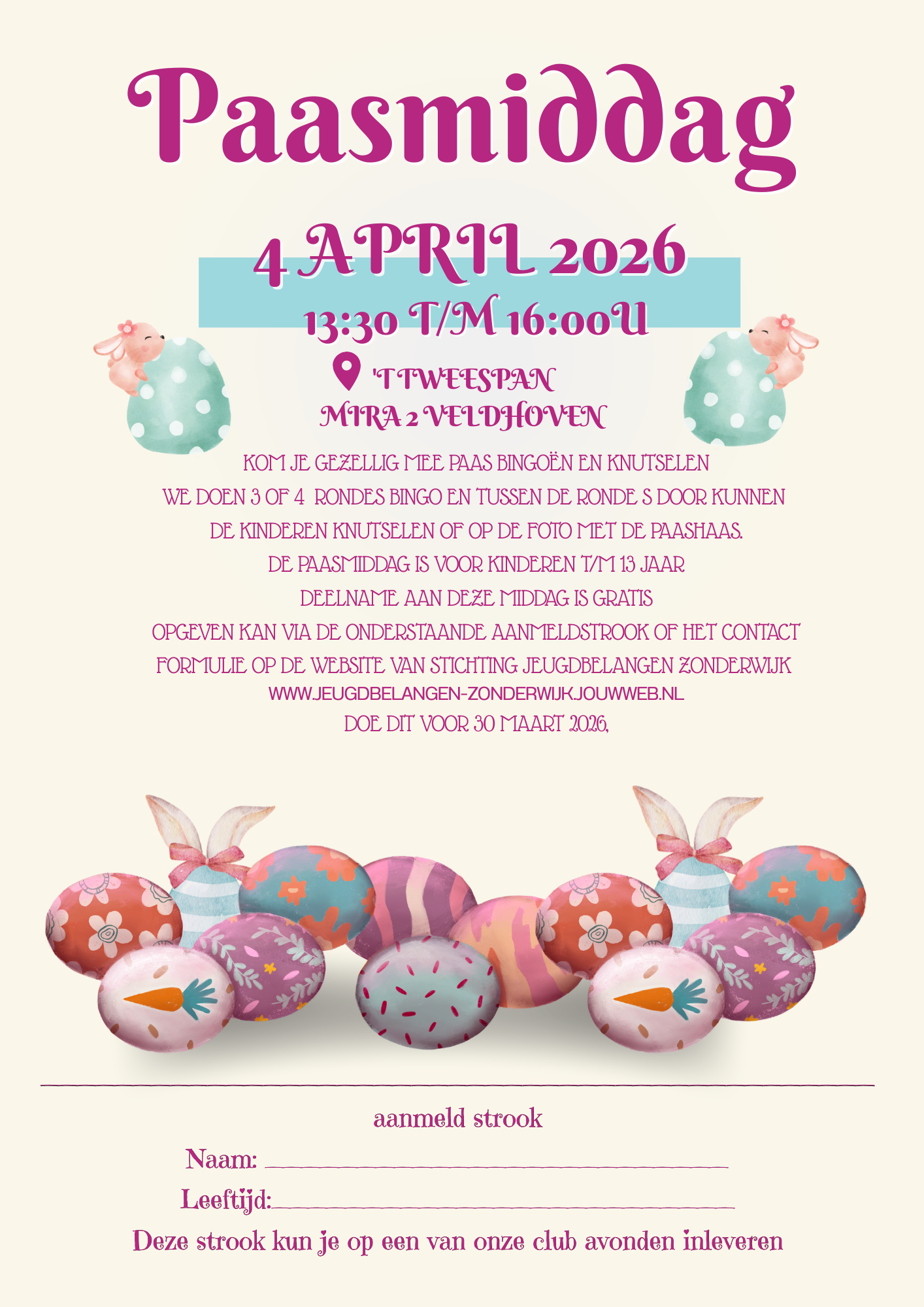 Vergeet niet je aan te melden vóór 30 maart! Dit is essentieel om een plekje te garanderen voor jouw kind en ervoor te zorgen dat we genoeg knutselmateriaal en prijzen hebben. Meld je nu aan en mis dit feest niet!
